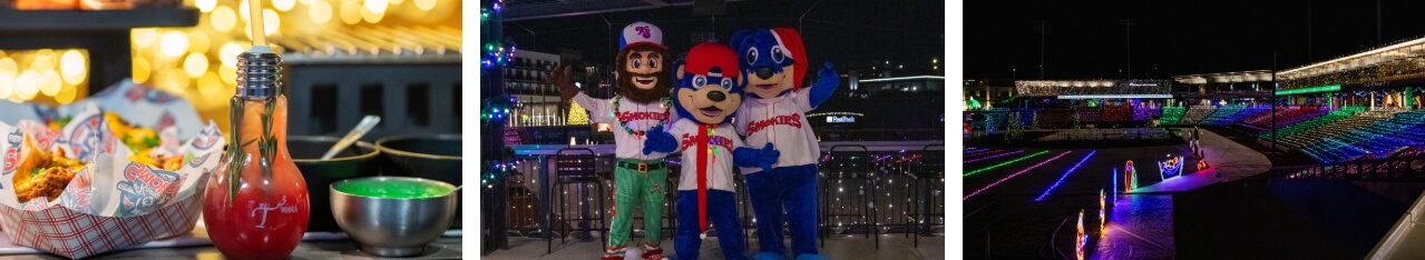 Each December, the Smokies Stadium takes a night job as a Christmas village funzone with a light show, displays, a meet and greet with Santa and much more that will be detailed in this press release from MLB (!) we are sharing.